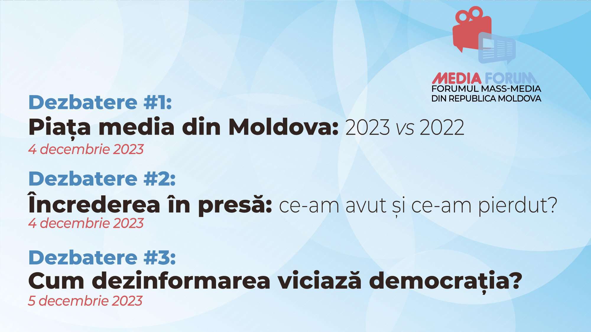 Ediția a opta a Forumului Mass-Media din Republica Moldova va avea loc pe 4 și 5 decembrie 2023 în municipiul Chișinău. Forumul este convocat anual sub egida Consiliului de Presă pentru a dezbate problemele comunității jurnalistice moldovenești, a identifica și a promova soluții pentru consolidarea independenței editoriale și a sustenabilității mass-mediei de calitate din țara noastră. Înregistrarea pentru participare la Forum va fi deschisă de pe 6 noiembrie 2023 pe platforma